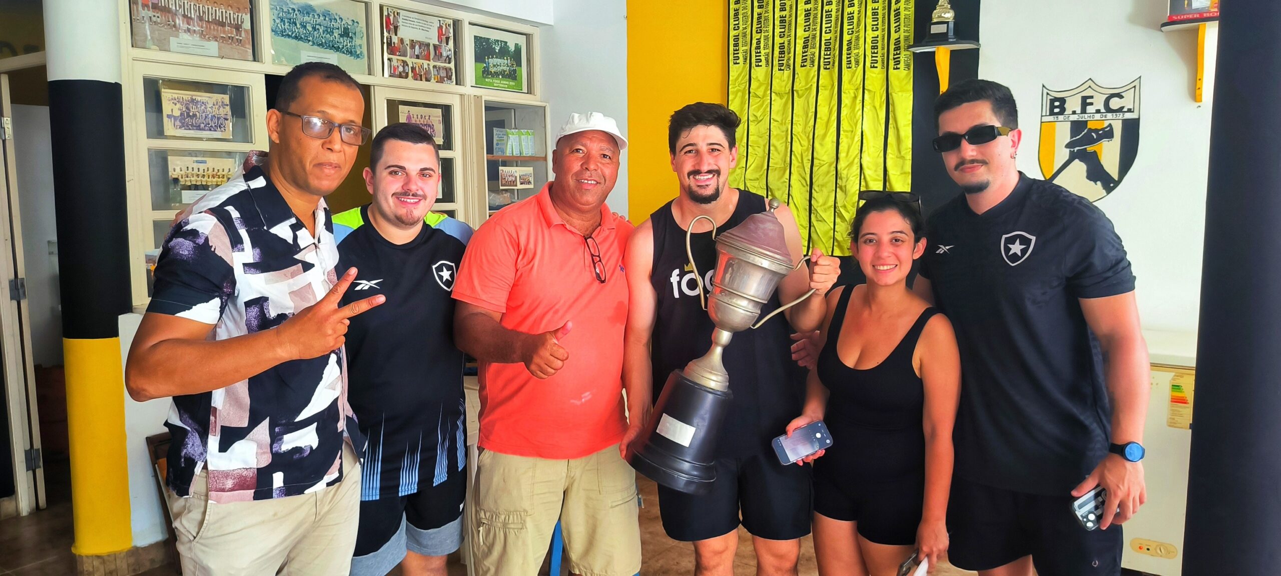 Na sua passagem pela “Sede do Glorioso” na Ilha do Fogo, a dupla e a sua equipa foram recebidos com entusiasmo e tiveram uma verdadeira aula de história. O ilustre Historiador Fausto do Rosário guiou a visita, desvendando a profunda ligação do clube foguense com o Botafogo de Futebol e Regatas do Brasil e narrando a trajetória da fundação até ao prestigiado título de Campeão de Cabo Verde!